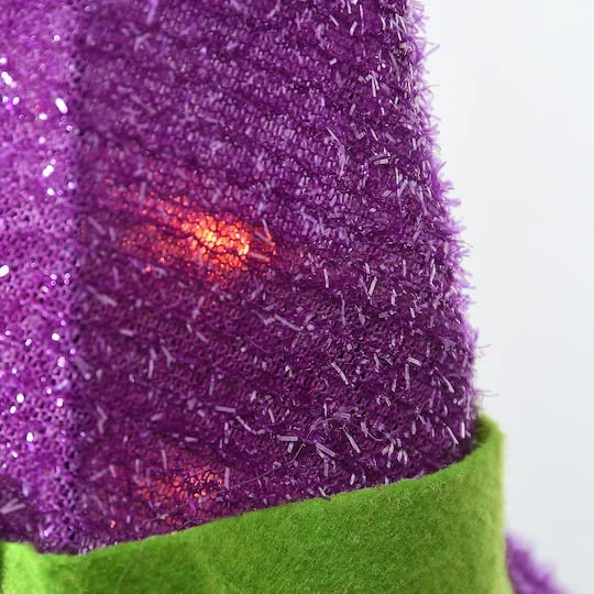 This spooky decoration will help set the scene for Halloween! This Halloween decoration features three Witch’s Hats, one purple, one orange and one black. Each is constructed of a glittering tinseled fabric that is wrapped around a sturdy wire frame and lit from inside.