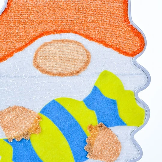 This fun and whimsical Halloween decoration is constructed of tinseled fabric over sturdy wire frames. Three white-bearded gnome characters each hold a Halloween-themed item: wrapped candy, skull, and jack-o-lantern. The outside perimeter of each figure is lined with a neon style light strip containing hundreds of LED lights that produce an orange glow. A rear stand for each provides upright display and ground stakes are included for outdoor use.