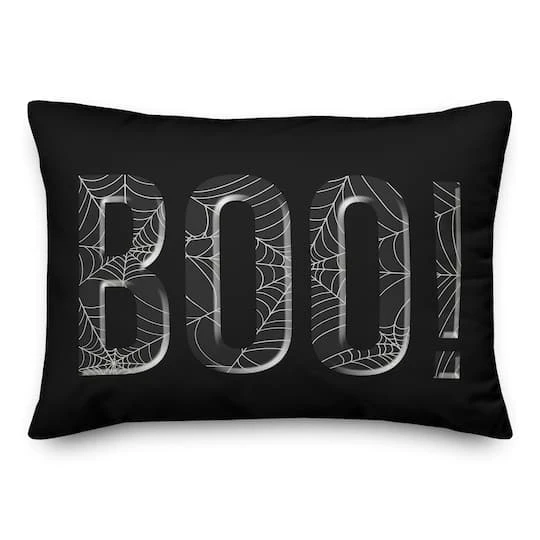 With a festive spiderweb boo design, this 14″ x 20″ spun polyester throw pillow is an excellent accent piece for your home this Halloween season.